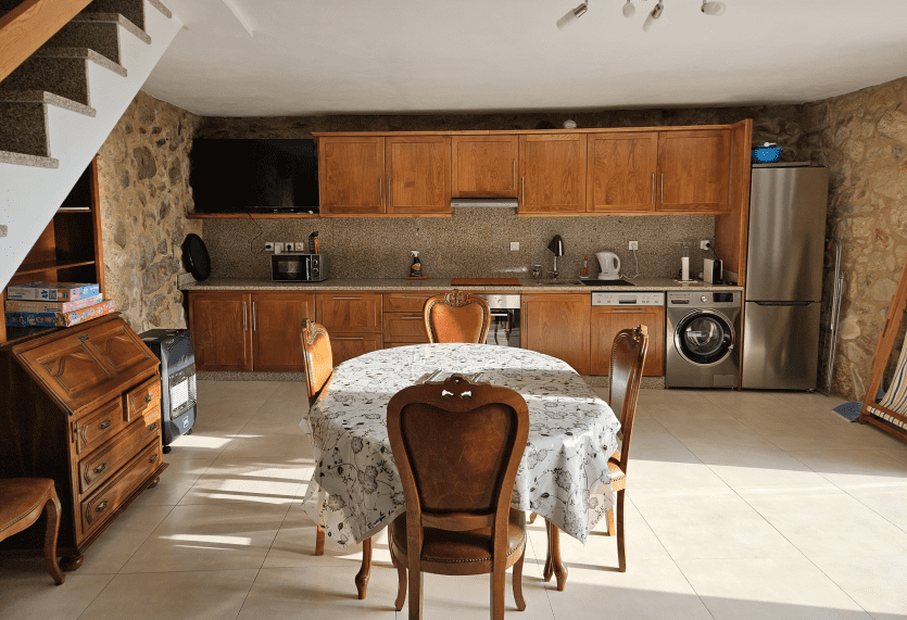 Maison en pierre, lumineuse, avec cuisine ouverte sur le salon au rez-de-chaussée et un espace terrasse. A l’étage, la salle d’eau avec WC, ainsi que deux chambres en enfilade (la chambre 2 est passante pour accéder à la chambre 1).